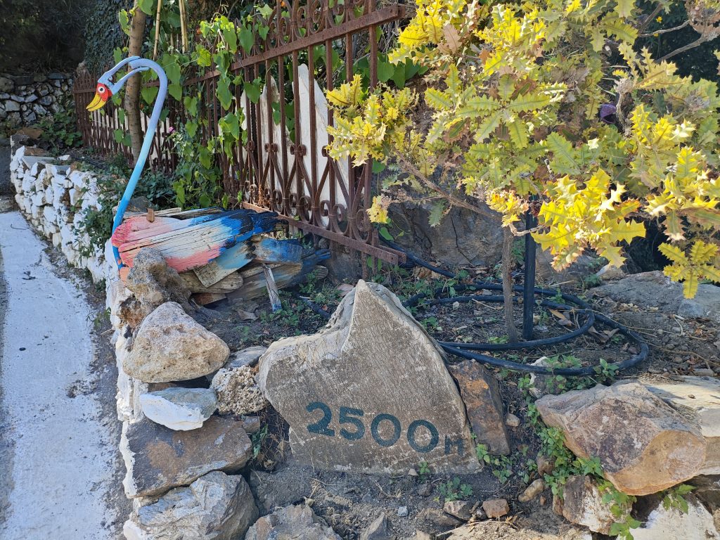 Der Weg verläuft zunächst in serpentinenartigen Kurven bergab. Als zusätzliche Information: am Eingang des botanischen Parks stehen aus Holz gefertigte Wanderstöcke zur Verfügung. Auf dem Weg begegnen wir zahlreichen tropischen und mediterranen Pflanzen sowie Obstbäumen.