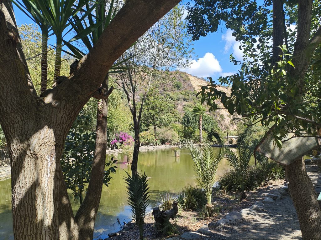 Nach etwa der Hälfte des Weges kann man eine Abkürzung nehmen. Ich empfehle allerdings, dies nicht zu tun, da wir uns noch nicht am tiefsten Punkt des Parks befinden. Unten im Tal erwartet uns eine besondere Atmosphäre. Da kommen wir an einem wunderschönen See vorbei, der nicht nur uns für eine Pause einlädt. Im gesamten Park begegnen uns immer wieder freilaufende Pfauen und Gänse. Besonders viele sehen wir hier unten.