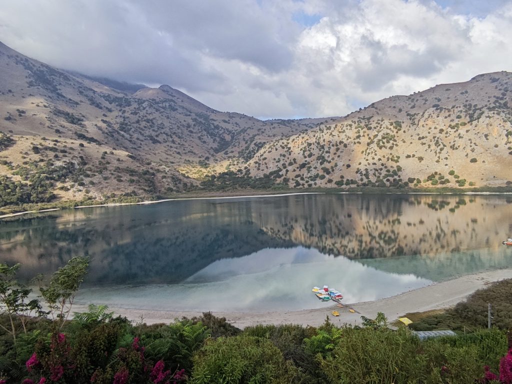 Unser erster Halt ist am Kournas See, der einzige natürliche Süßwassersee auf Kreta. An einer Seite des Sees befinden sich Cafés und Restaurants mit Blick auf das Wasser. Im Sommer kann man den See auf einem Weg von etwa 3,5 km umrunden. Zudem besteht die Möglichkeit, Tretboote zu mieten. Der See bietet Schutz für zahlreiche Vogelarten wie Enten und Kormorane, auch Schildkröten findet man hier zahlreich.