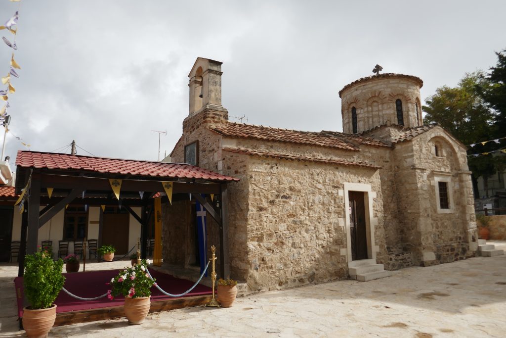Die Kreuzkuppelkirche befindet sich im Innenhof eines ehemaligen Klosters, das im 10. Jahrhundert von Ioannis Xenos gegründet wurde. Der Legende nach hörte er die Stimme der Jungfrau Maria, die ihm zurief: „Hier bin ich.“ Daraufhin fand er die Ikone der Jungfrau Maria. Heute ist von den alten Gebäuden nur noch das alte Katholikon erhalten, die Kreuzkuppelkirche, die heute noch als Pfarrkirche dient. Im Inneren der Kirche befinden sich dreischichtige Fresken, aus dem 11., 13. und 14. Jahrhundert. Das Fotografieren in der kleinen Kirche ist nicht erwünscht. Wer jedoch einen Eindruck gewinnen möchte, findet auf verschiedenen Bewertungsportalen zahlreiche Bilder.