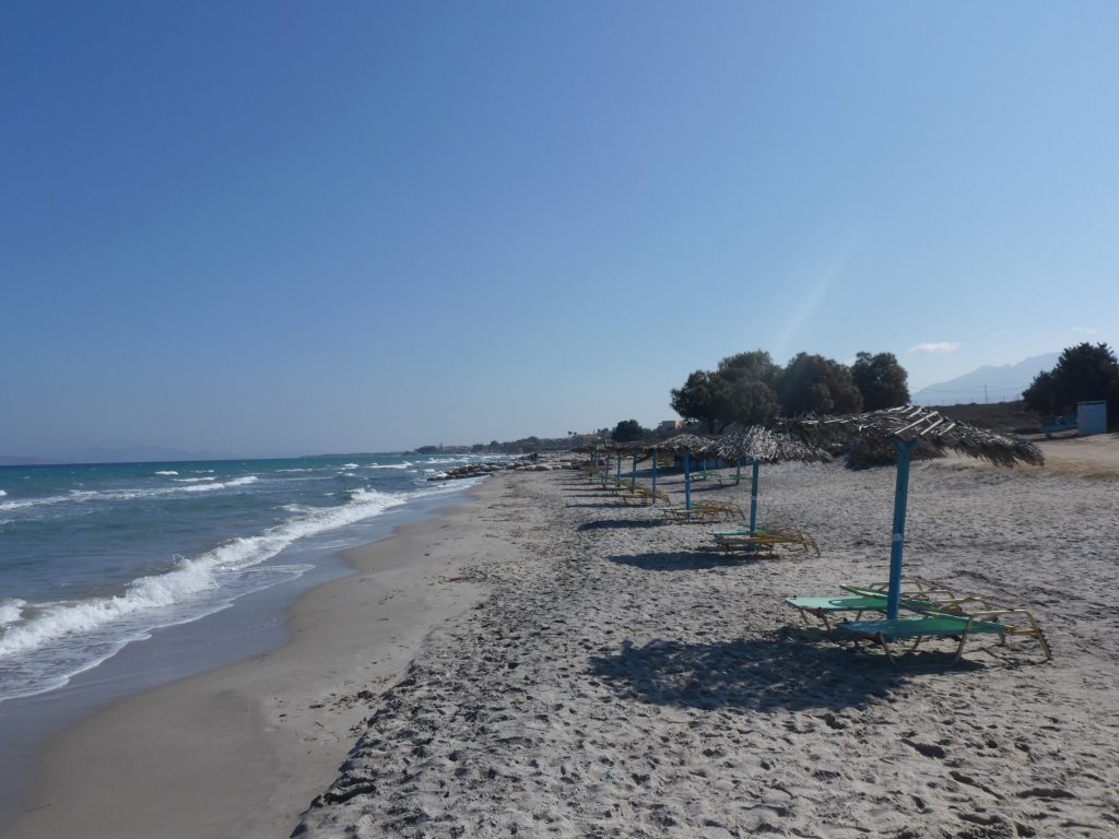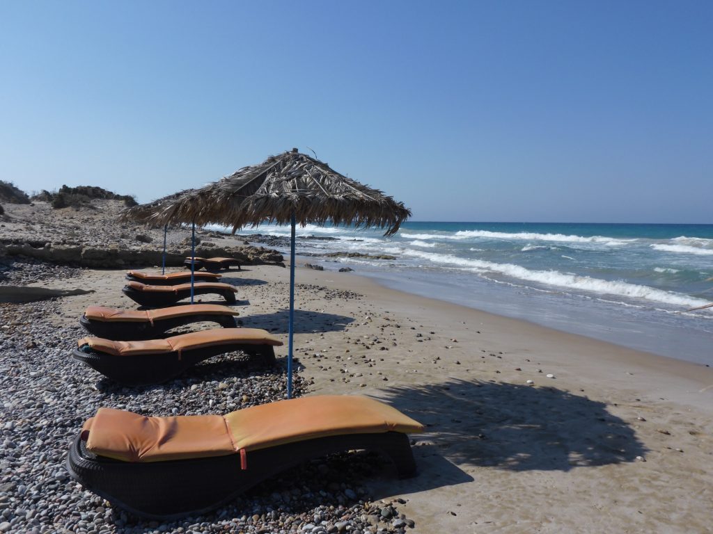 Der Strand Agios Theologos ist von einer beeindruckenden Küstenlandschaft geprägt, die von einem kleinen Felshang umgeben ist. Diese Felsen verleihen dem Strand eine einzigartigen Atmosphäre bei. Am Strand stehen Liegen und Sonnenschirme zur Verfügung, die man gegen eine Gebühr mieten kann. In der Nähe gibt es eine gute Taverne, in der man Erfrischungen und lokale Gerichte genießen kann. Von hier aus bietet sich eine Wanderung über die südliche Spitze von Kos an, für weitere Informationen schaue dir den Beitrag wandern auf Kos an.
