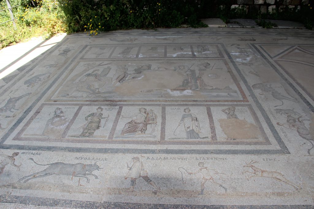 Durch das Gebiet führen uns zwei alte Straßen, Cardo und Decumana, deren Pflaster heute noch sehr gut erkennbar sind. Wir starten unsere Tour durch das Ausgrabungsgebiet im nördlichen Teil, wo wir direkt ein großes Mosaik aus römischer Zeit entdecken.