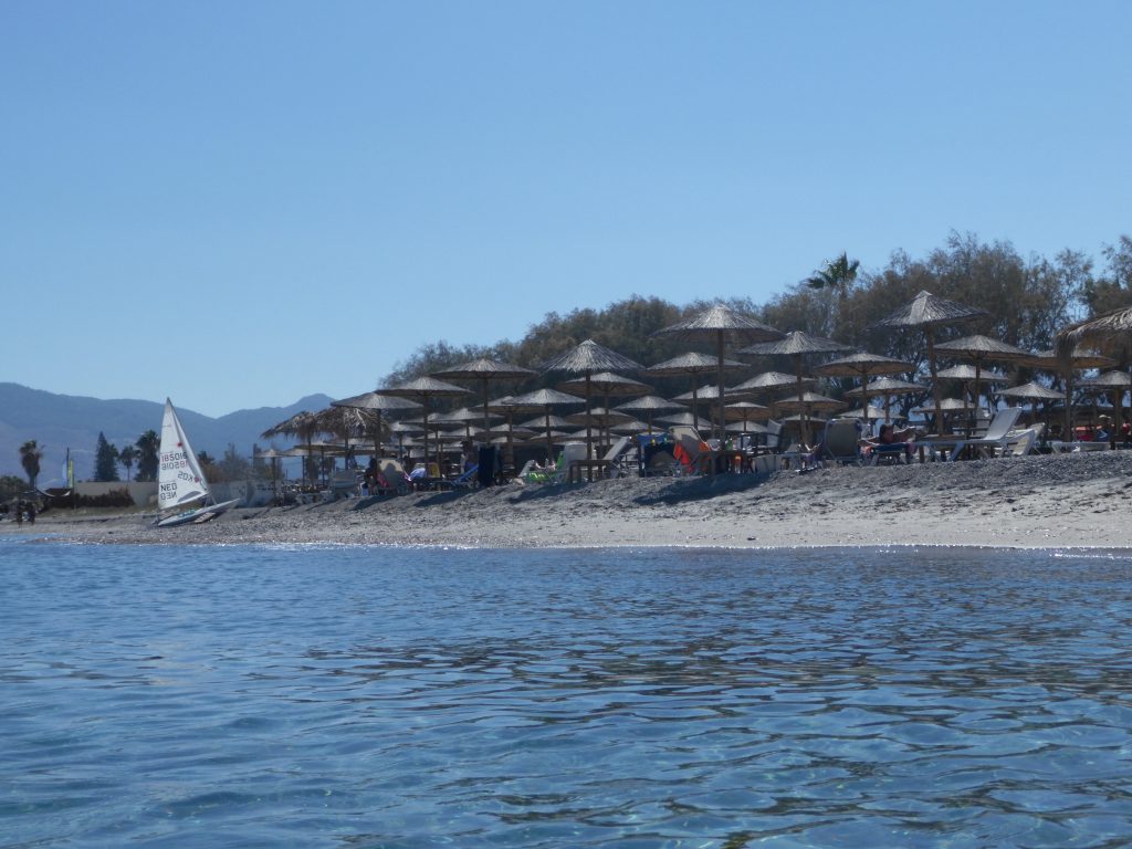 Eine Strandbar außerhalb des Dorfes Mastichari und sehr touristisch geprägt. Je nach Jahreszeit kann man hier den Sonnenuntergang beobachten (Stand: 2019).