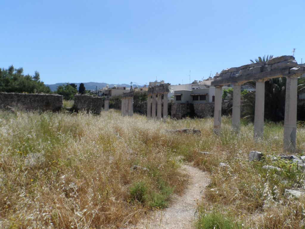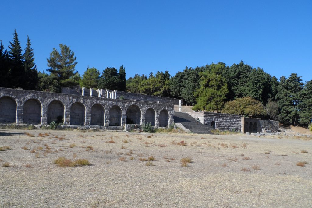 Wenn wir der alten Straße weiter folgen, erreichen wir den Platz, an dem in der Antike das Gymnasium stand. Dies diente als Sportanlage mit einer überdachten Laufbahn, so dass die Athleten auch im Winter und bei Regen trainieren konnten. Die Anlage wird in das zweite Jahrhundert vor Christus datiert, damals standen hier 80 Säulen.