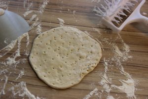 - Wir formen die Pita mit einer Breite von ca. 15 cm und gehen einmal mit einem Stipproller über den Fladen, alternativ mehrmals mit einer Gabel einstechen.