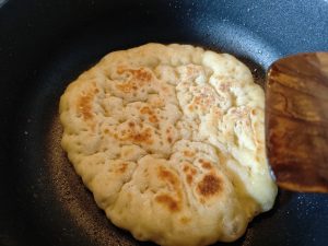 - Die Pita wird in einer Pfanne mit Olivenöl ausgebacken. Wir wenden die Pita dreimal und lassen sie jeweils 50 Sekunden braten.