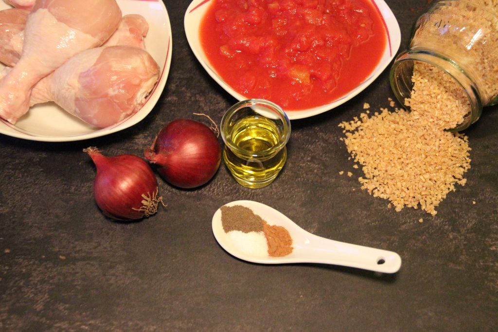 - Anschließend geben wir Tomaten, Wasser, Salz, Pfeffer und Zimt dazu und rühren alles vorsichtig um. Das Hähnchen sollte nun gut von der Flüssigkeit bedeckt sein. Wir lassen es 15 Minuten bei mittlerer Hitze garen, ohne dass sie Flüssigkeit kocht. Anschließend nehmen wir das Hähnchen heraus und legen es beiseite.1/2 TL Zimt, Salz und Pfeffer, 2 Tassen Wasser, 400 g Tomaten