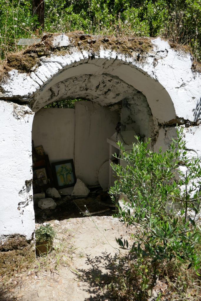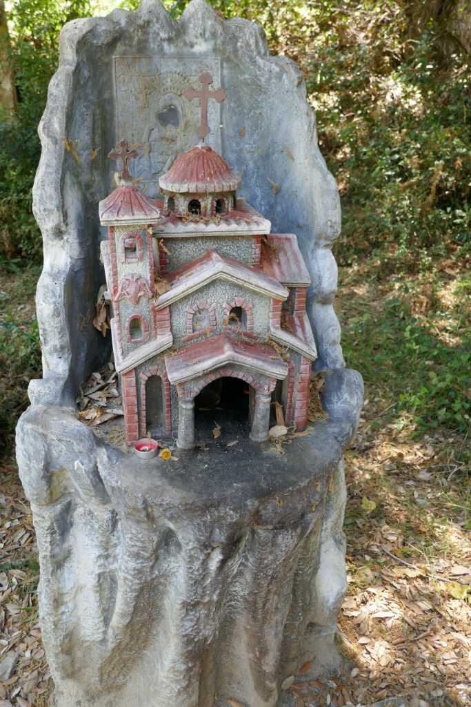 Nach dem Durchqueren des Klosterhofs folgt ein kurzer Abstieg zu dem Gedenkstein des Eremtien und einer Höhlenkapelle.