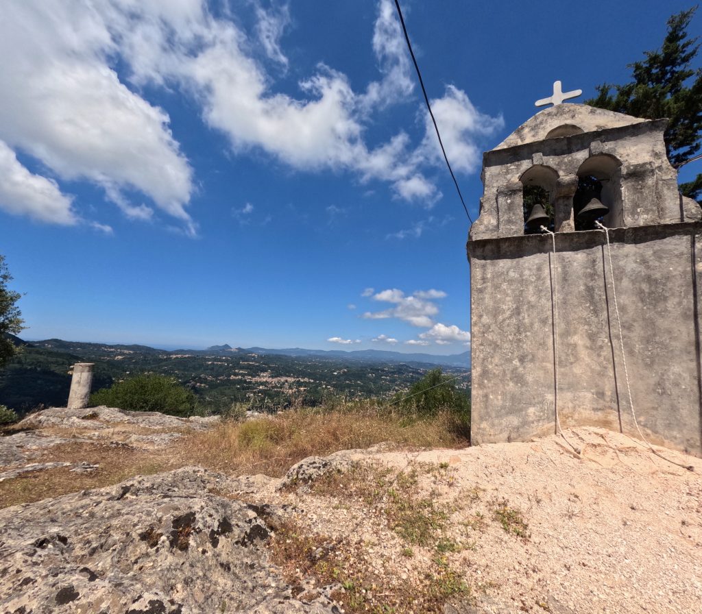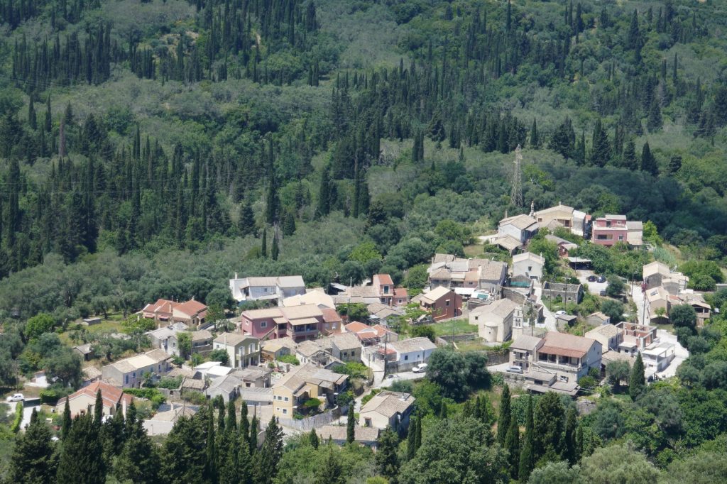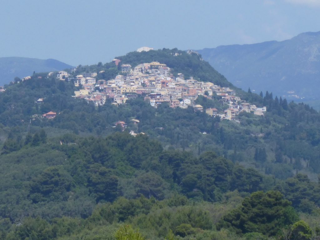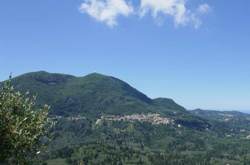 Unser Blick erstreckt sich weiter über die Dörfer Sinarades und Pelekas bis zur Stadt Kerkyra. Wer den Korfutrail von Agii Deka bis nach Pelekas gewandert ist, kann hier stolz auf seine Leistung zurückblicken.